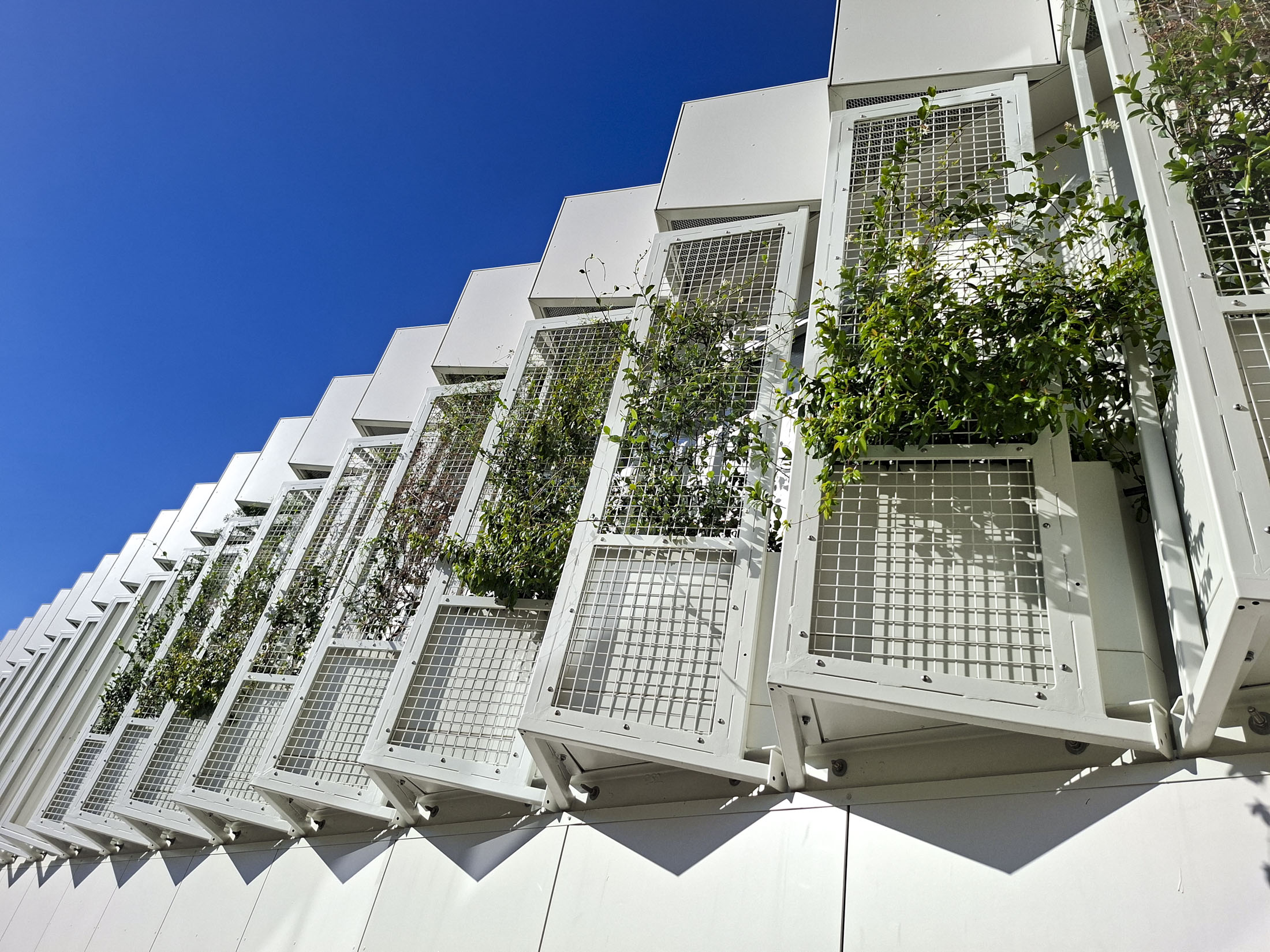 The system consists of 20 fire‑compliant irregularly shaped planter boxes engineered to a depth of 750mm, including a 150mm void supporting a selection of climbing plant species chosen for façade performance, durability and low maintenance.