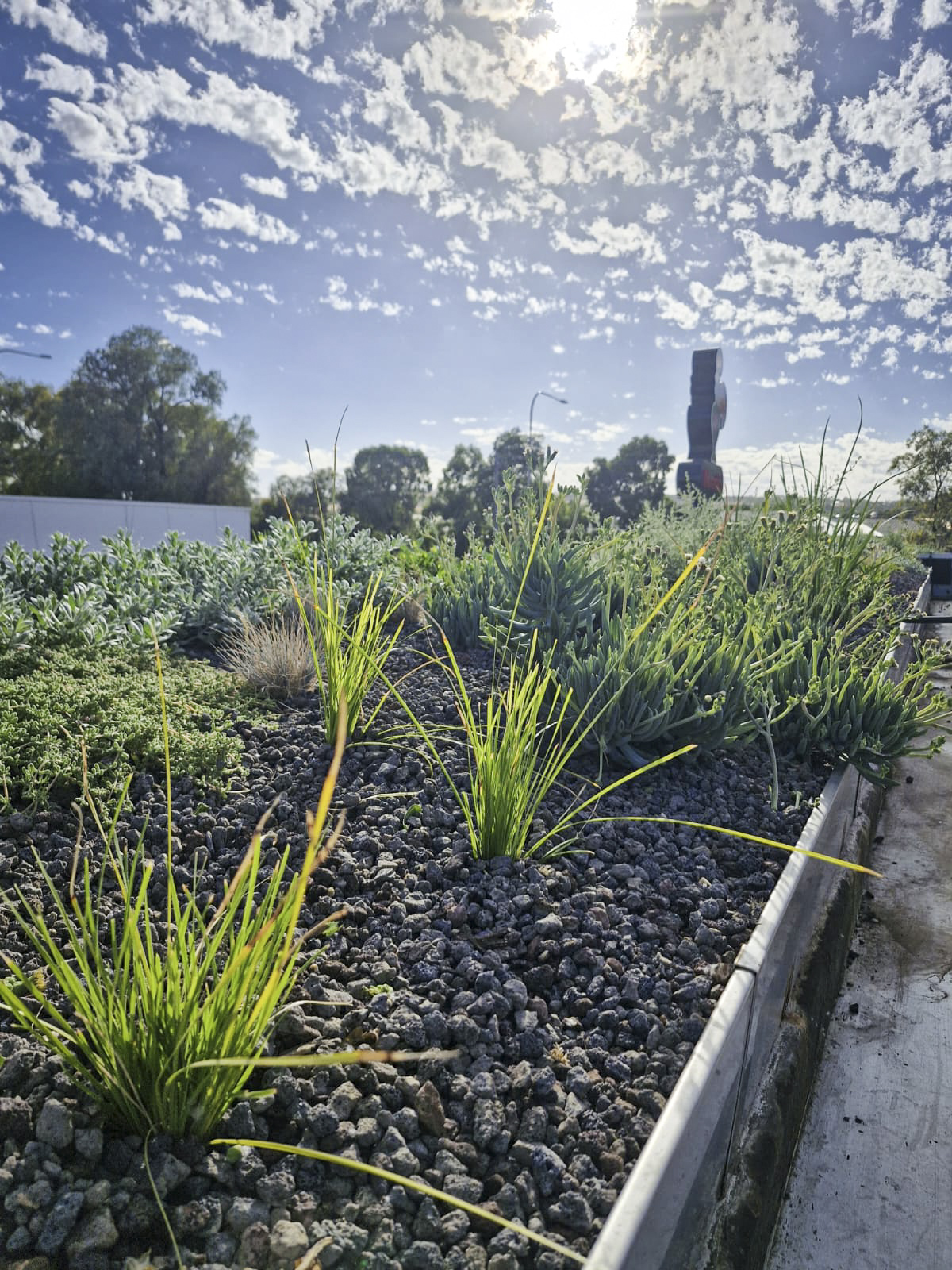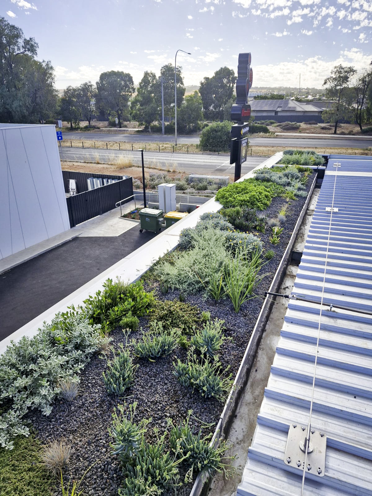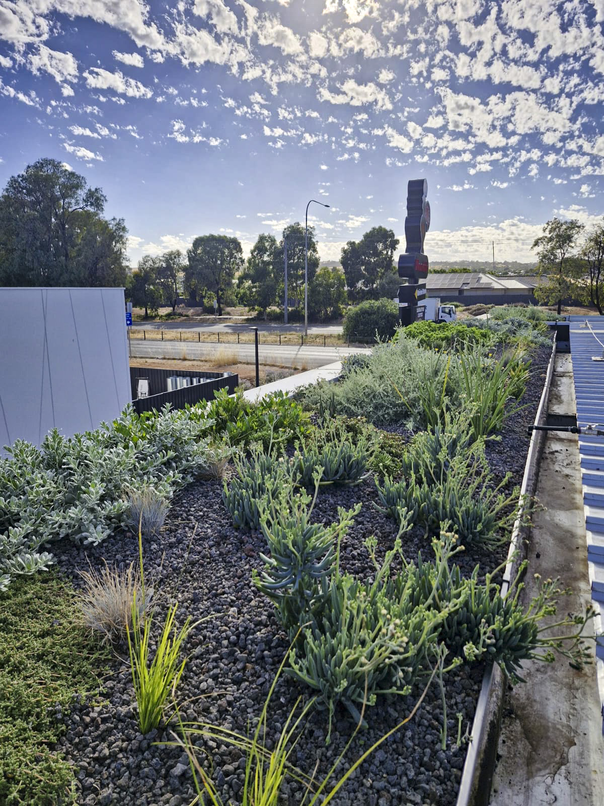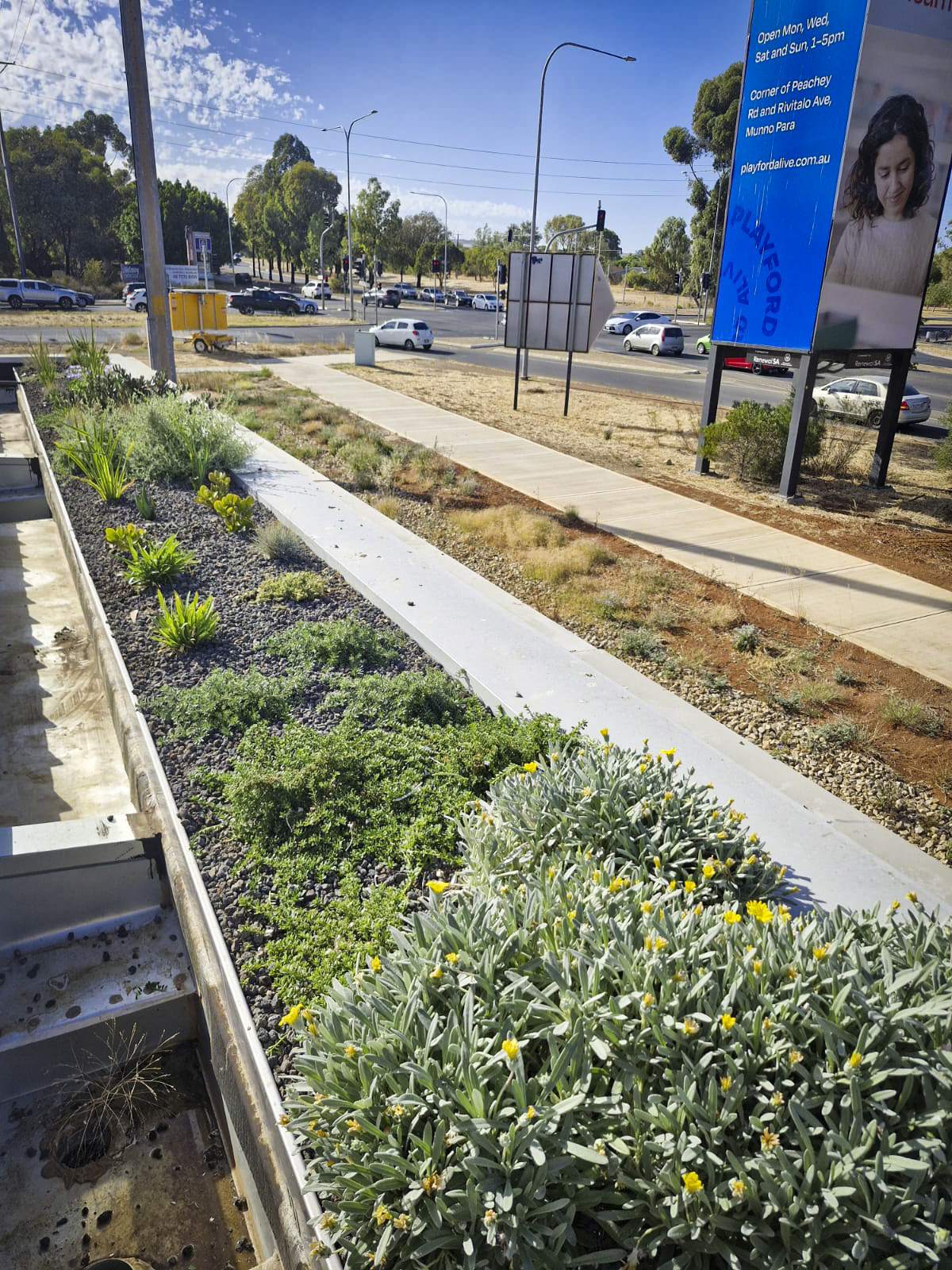 Located at the corner of Main North Road and Curtis Road in Munno Para, South Australia, the roof gardens span a combined 36.5 m² and are engineered with a 160 mm profile depth.  The system supports 302 plants across 29 resilient species, selected for durability in exposed rooftop conditions and low ongoing maintenance.